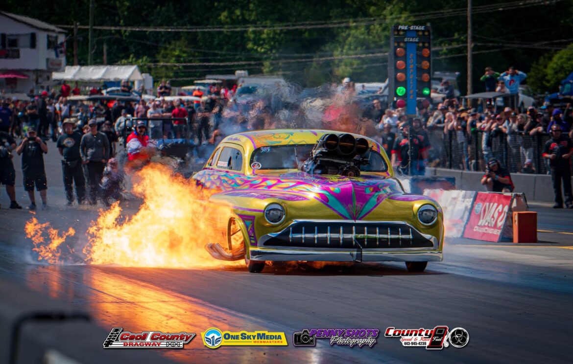 After qualifying Kurt Steding was sitting on top of the time charts with a first round bye due to an odd number of cars. (25). The first round was one that would go down as very eventful to say the leads. William Brown III had a violent top end accident as the car got out of the groove and made a quick right turn heading straight into the wall and crossing the race track and hitting the other wall and flipping over. I must tell you this is very hard to film especially when your Live Streaming. After the car came to rest we repositioned the camera until we received notification that William was OK. William and his wife walked all the way up the return road while clean up efforts were underway. That was a true testament of how well these cars are built. After the clean up we were back to racing. In the next pair or two fan favorite Craig Sullivan in his beautiful Mercury had a major engine explosion around the 60 ft cone that resulted in a very damaging fire to the iconic ElMeroMero Mercury. Craig was in not Injured and walked dejectedly up the race track after the episode. Another lengthy clean up was under way. Jim Halsey was instrumental in both of these cleanups and when he was done he hopped in his ProMod and went down the track. I have a new found respect for his work ethic after these two events. The remainder of the first round proceeded on with out further incidents.